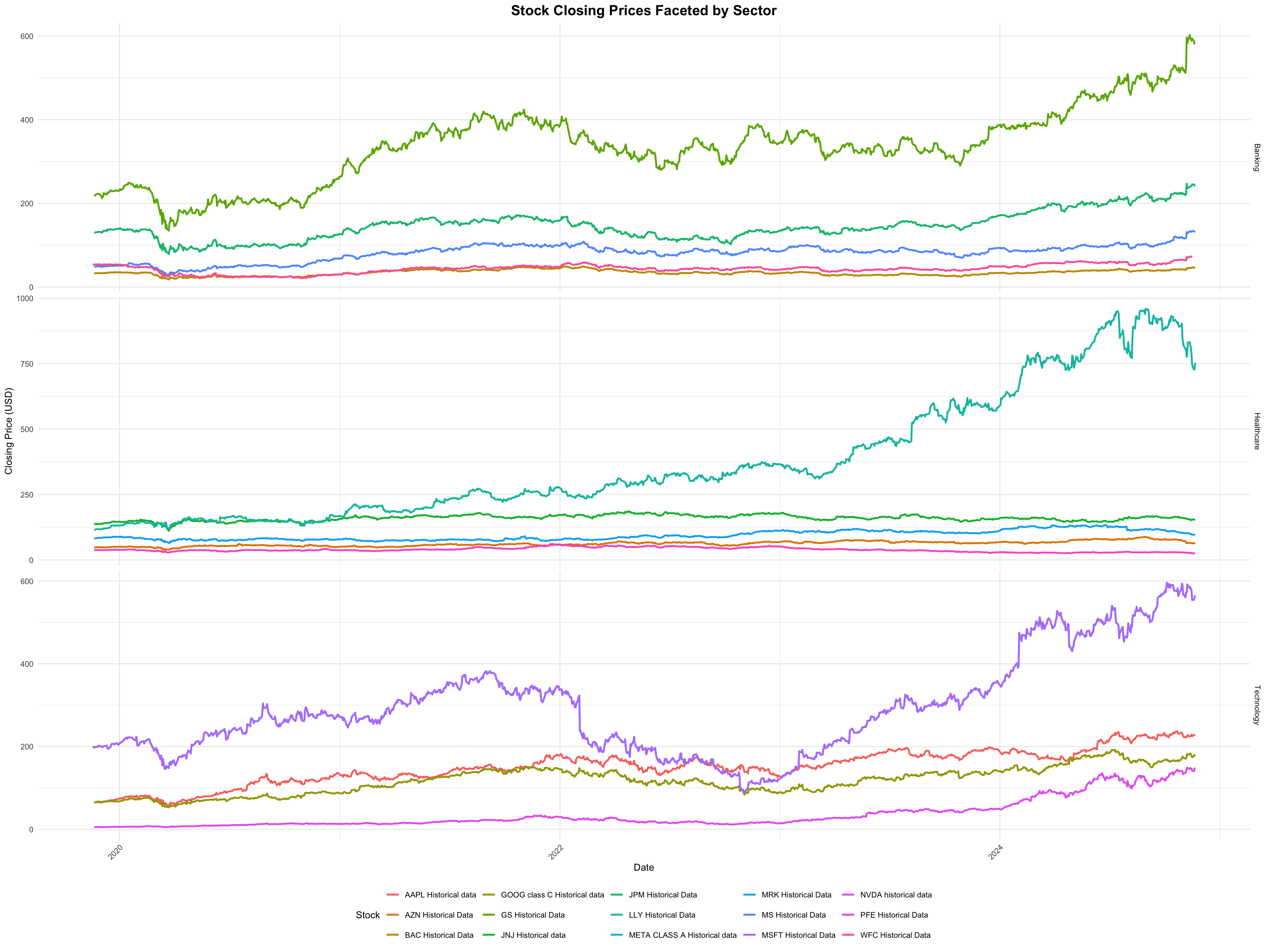 Tech stocks are showing pronounced growth over time due to the investors’ belief of growth in technology. Particularly for Nvidia, there is a significant increase. In healthcare, Eli Lilly is exhibiting a steady growth although not as steep as Technology. There is a slower but stable upward trend in the banking sector. This could be attributed to various reasons. One being the restrictions and regulations that the banking sectors must adhere to which limits their rapid expansion. The other one might be their focus on mature markets rather than younger ones. Unlike Tech and some healthcare companies, the banks look for stability over innovation. They might require stable economic growth and there are very few growth opportunities in a mature market. We have stated a few reasons as to why the slower increase is seen, but there are various other reasons as well.