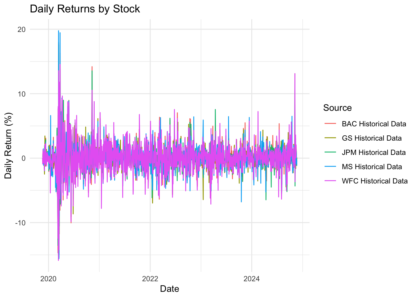 # Install and load required packages# Install and load required packages#install.packages("slider")library(slider)library(ggplot2)library(dplyr)# Calculate daily returnsbanking_data <- banking_data |>group_by(Source) |>arrange(date) |>mutate(daily_return = (close /lag(close) -1) *100) |>ungroup()# Calculate volatility (20-day rolling standard deviation of returns)banking_data <- banking_data |>group_by(Source) |>mutate(volatility =slide_dbl(daily_return, sd, .before =19, .complete =TRUE)) |>ungroup()# Calculate average returnsavg_returns <- banking_data |>group_by(Source) |>summarize(avg_daily_return =mean(daily_return, na.rm =TRUE)) |>arrange(desc(avg_daily_return))print(avg_returns)