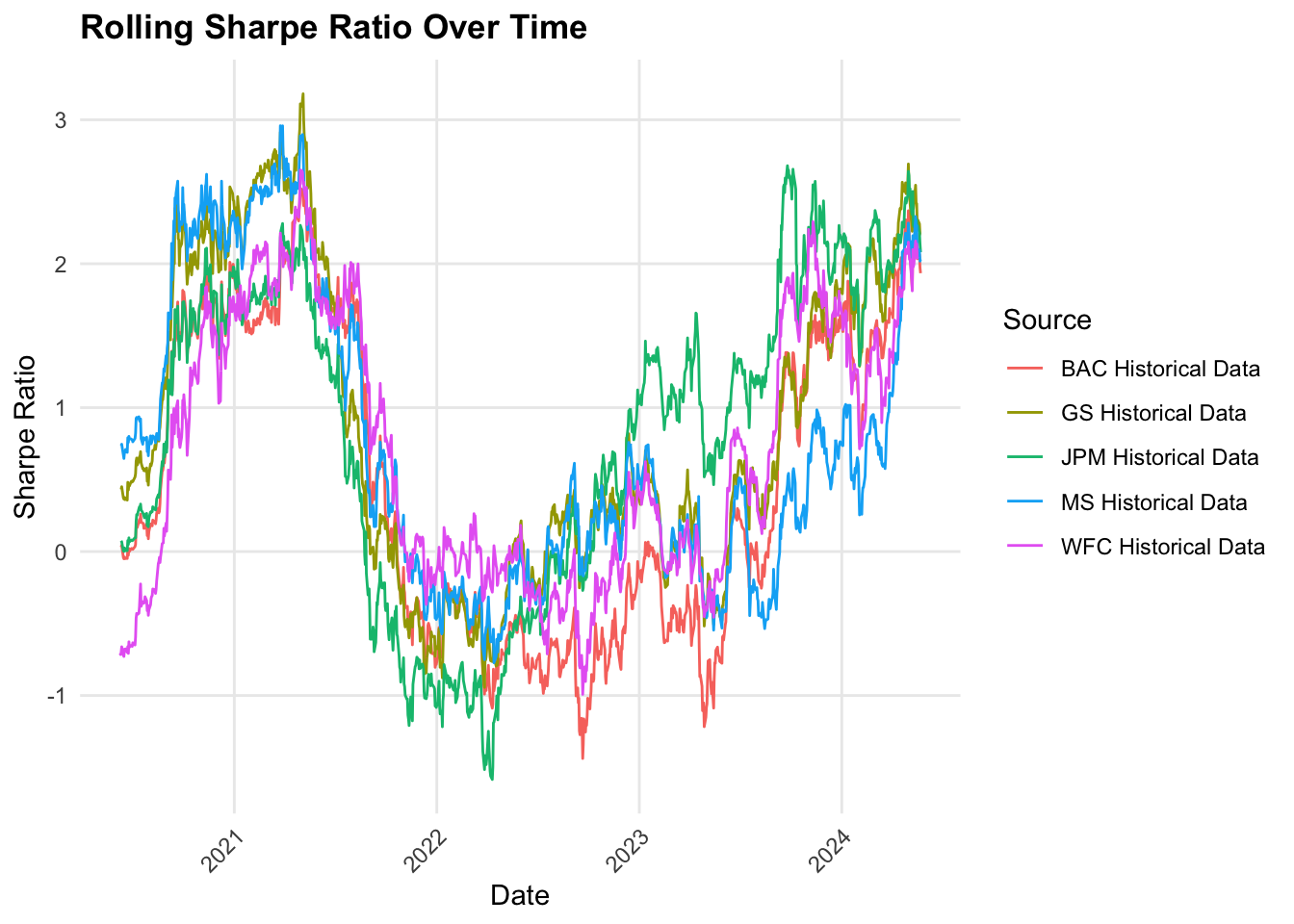Around 2020-2021, the Sharpe ratio for all stocks spiked significantly. This indicates higher risk-adjusted returns due market rebound following the pandemic. The banking sector benefitted from government aid, economic recovery and trading revenues. However, it dipped again in 2022 due to inflation, interest rate changes, potential recession concerns and so on. From 2023, it has improved a lot and the recovery correlates with interest rate stabilization and improved market sentiments.But of all these stocks, WFC has the lower and more fluctuating Share Ratios. GS is also seen to have a higher volatility in Sharpe Ratio due the nature of its firm(it relies more on investment banking and trading).