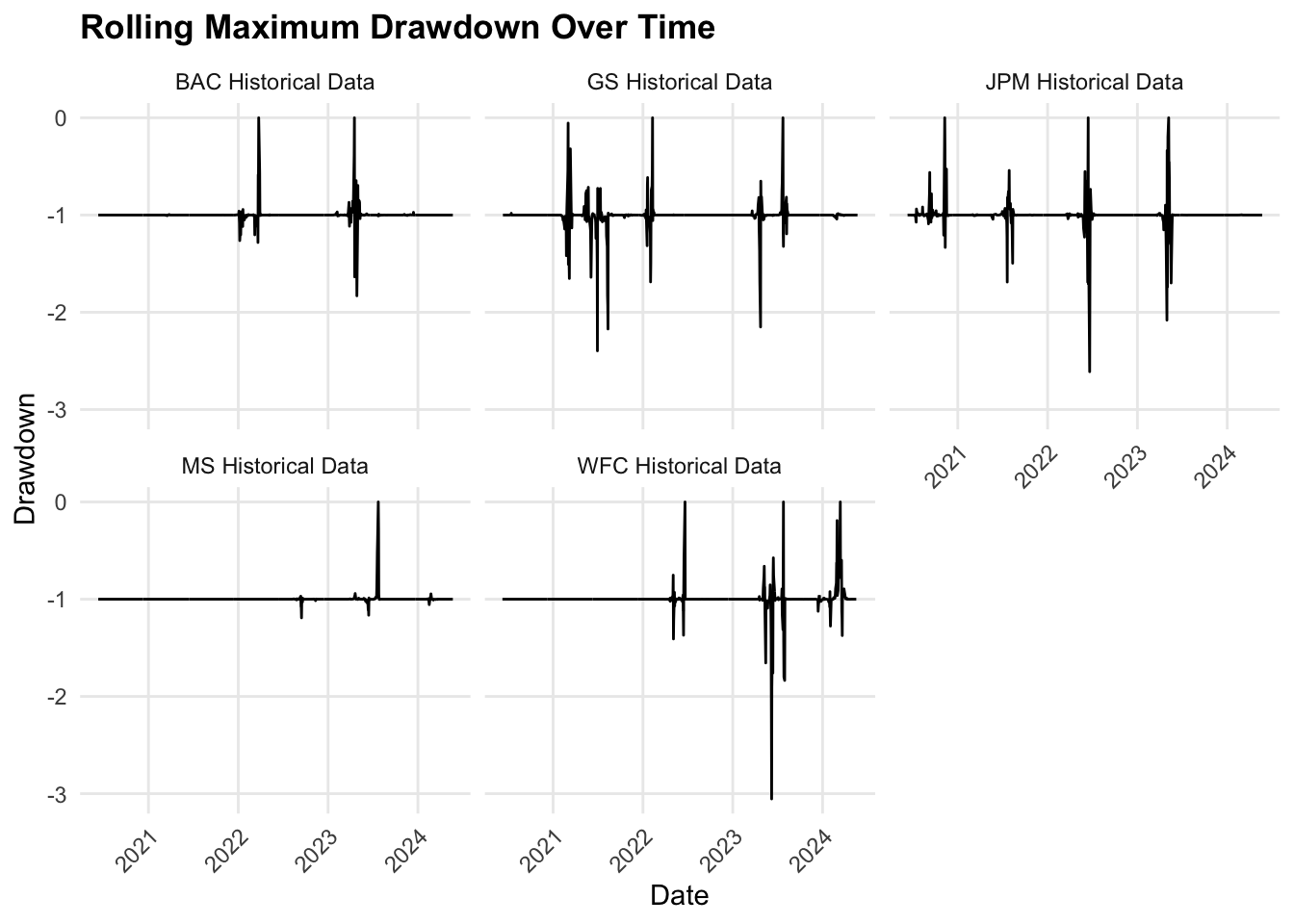 # Create rolling maximum drawdown plotdrawdown_plot <-ggplot(banking_data, aes(x = date, y = rolling_drawdown, color = Source)) +geom_line() +labs(title ="Rolling Maximum Drawdown Over Time (252-day window)",x ="Date", y ="Drawdown") +theme_minimal() +theme(legend.position ="bottom")ggplot(banking_data, aes(x = date, y = rolling_drawdown)) +geom_line() +labs(title ="Rolling Maximum Drawdown Over Time",x ="Date", y ="Drawdown") +theme_minimal() +theme(panel.grid.minor =element_blank(),axis.text.x =element_text(angle =45, hjust =1),plot.title =element_text(face ="bold") ) +facet_wrap(~Source)