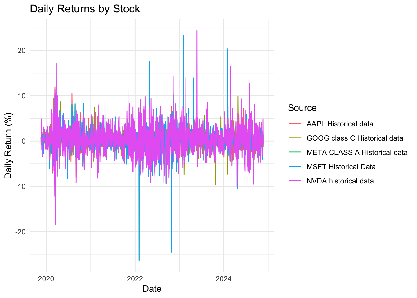 tech_data_clean <- tech_data |>filter(!is.na(daily_returns))# Plot daily returnsggplot(tech_data_clean, aes(x = date, y = daily_returns, color = Source)) +geom_line() +labs(title ="Daily Returns by Stock", x ="Date", y ="Daily Return (%)") +theme_minimal()