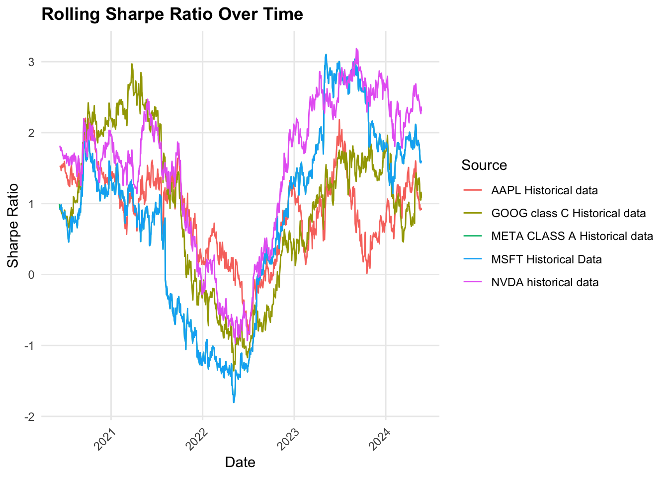This ratio fluctuates significantly over time. For most of the stocks, there is a noticeable dip around 2022 signaling high market volatility or low returns. We can speculate that this could be because of the economic slowdown, political conflicts and global uncertainty due to a series of issues within the last 5 year period. NVDA has an outstanding Sharpe Ratio reflecting higher risk-adjusted performance despite having a negative ratio around 2022. Consequently, GOOG and AAPL had negative ratios but slower increases from the initial drastic dip, which indicated that the returns were not sufficient for the risk associated with them. Infact, AAPL’s performance increased in 2023 but dipped again near 2024.