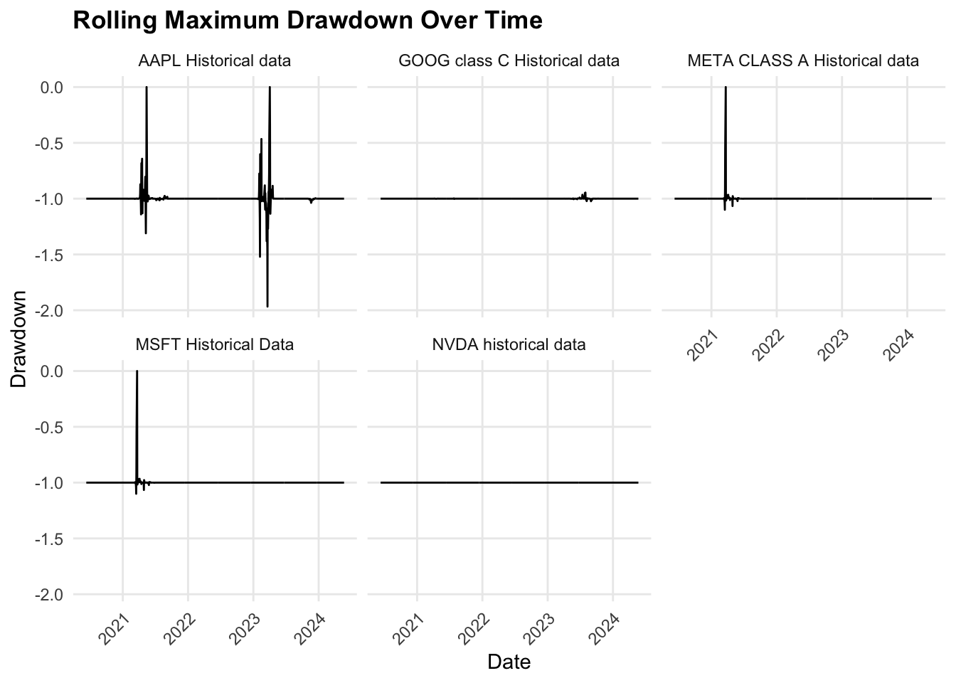 drawdown_plot <-ggplot(tech_data, aes(x = date, y = rolling_drawdown, color = Source)) +geom_line() +labs(title ="Rolling Maximum Drawdown Over Time (252-day window)",x ="Date", y ="Drawdown") +theme_minimal() +theme(legend.position ="bottom")ggplot(tech_data, aes(x = date, y = rolling_drawdown)) +geom_line() +labs(title ="Rolling Maximum Drawdown Over Time",x ="Date", y ="Drawdown") +theme_minimal() +theme(panel.grid.minor =element_blank(),axis.text.x =element_text(angle =45, hjust =1),plot.title =element_text(face ="bold") ) +facet_wrap(~Source)