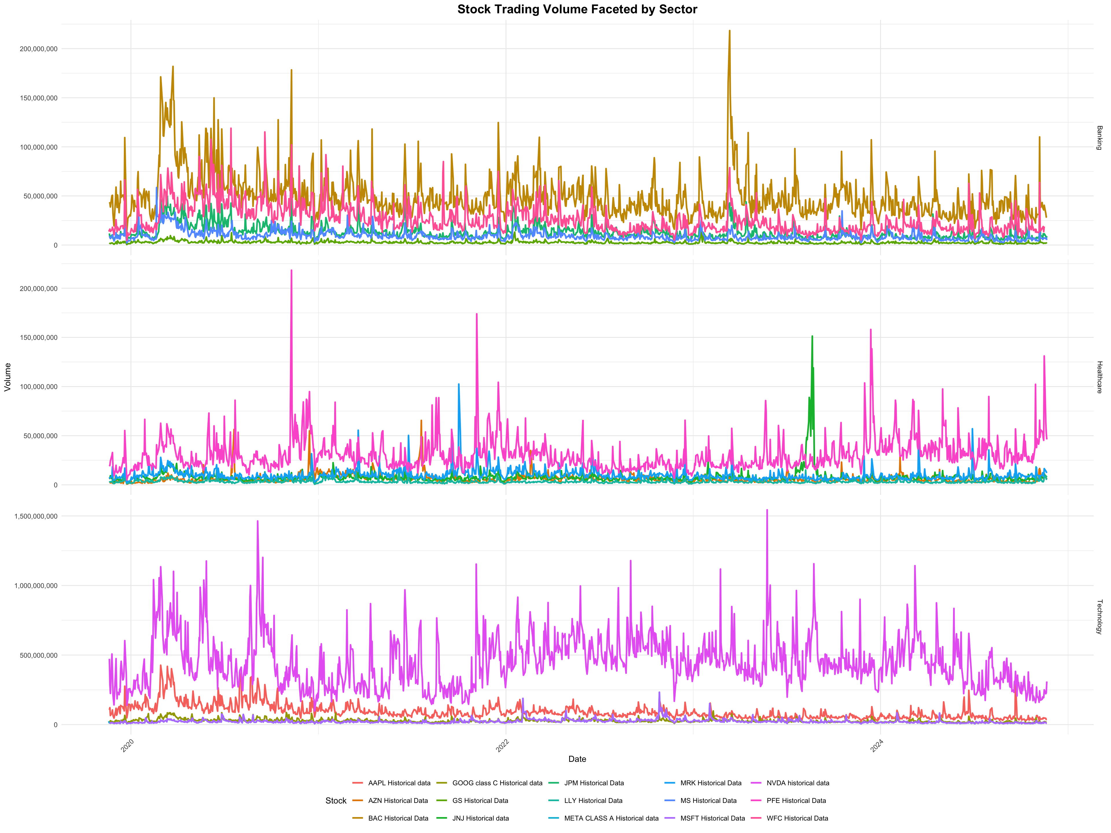 p <-ggplot(combined_data, aes(x = date, y = volume, color = Stock)) +geom_line(size =1) +facet_grid(Sector ~ ., scales ="free_y") +labs(title ="Stock Trading Volume Faceted by Sector",x ="Date",y ="Volume",color ="Stock" ) +scale_y_continuous(labels = scales::comma) +theme_minimal() +theme(plot.title =element_text(hjust =0.5, size =16, face ="bold"),axis.text.x =element_text(angle =45, hjust =1),legend.position ="bottom" )print(p)