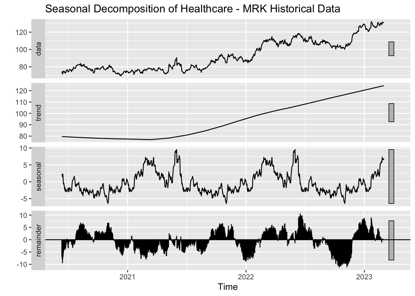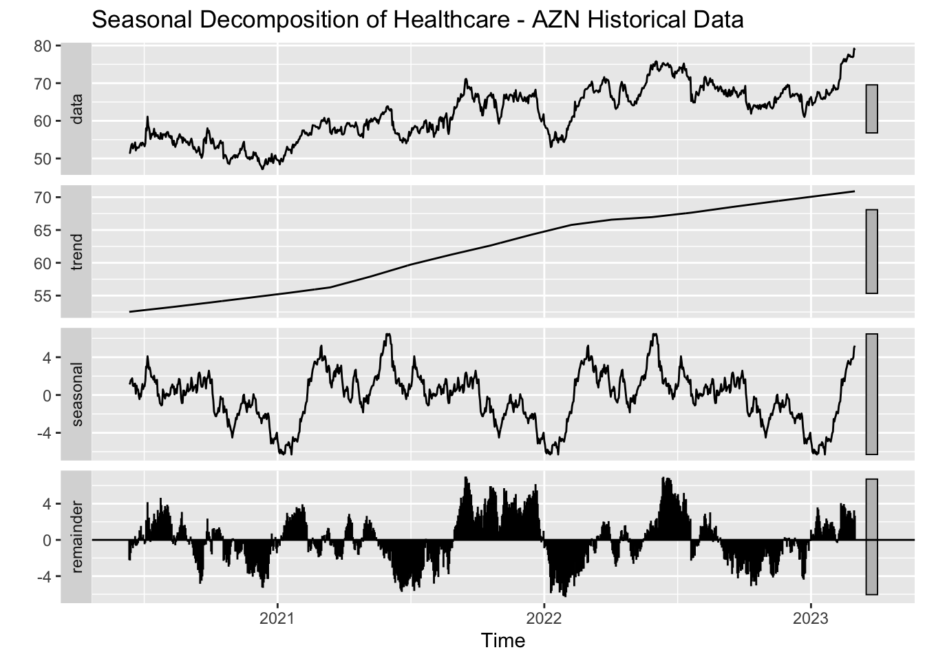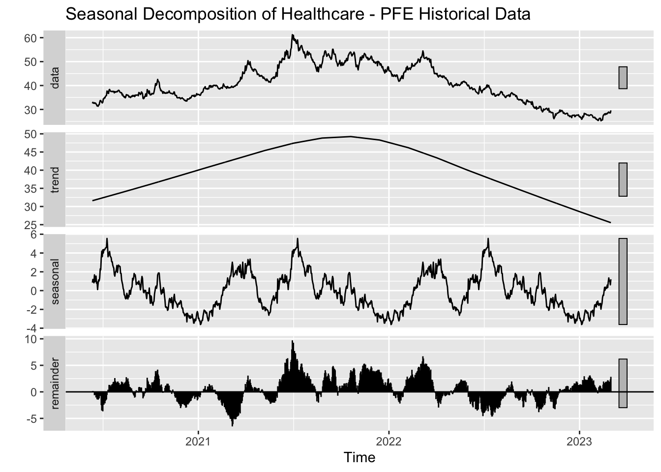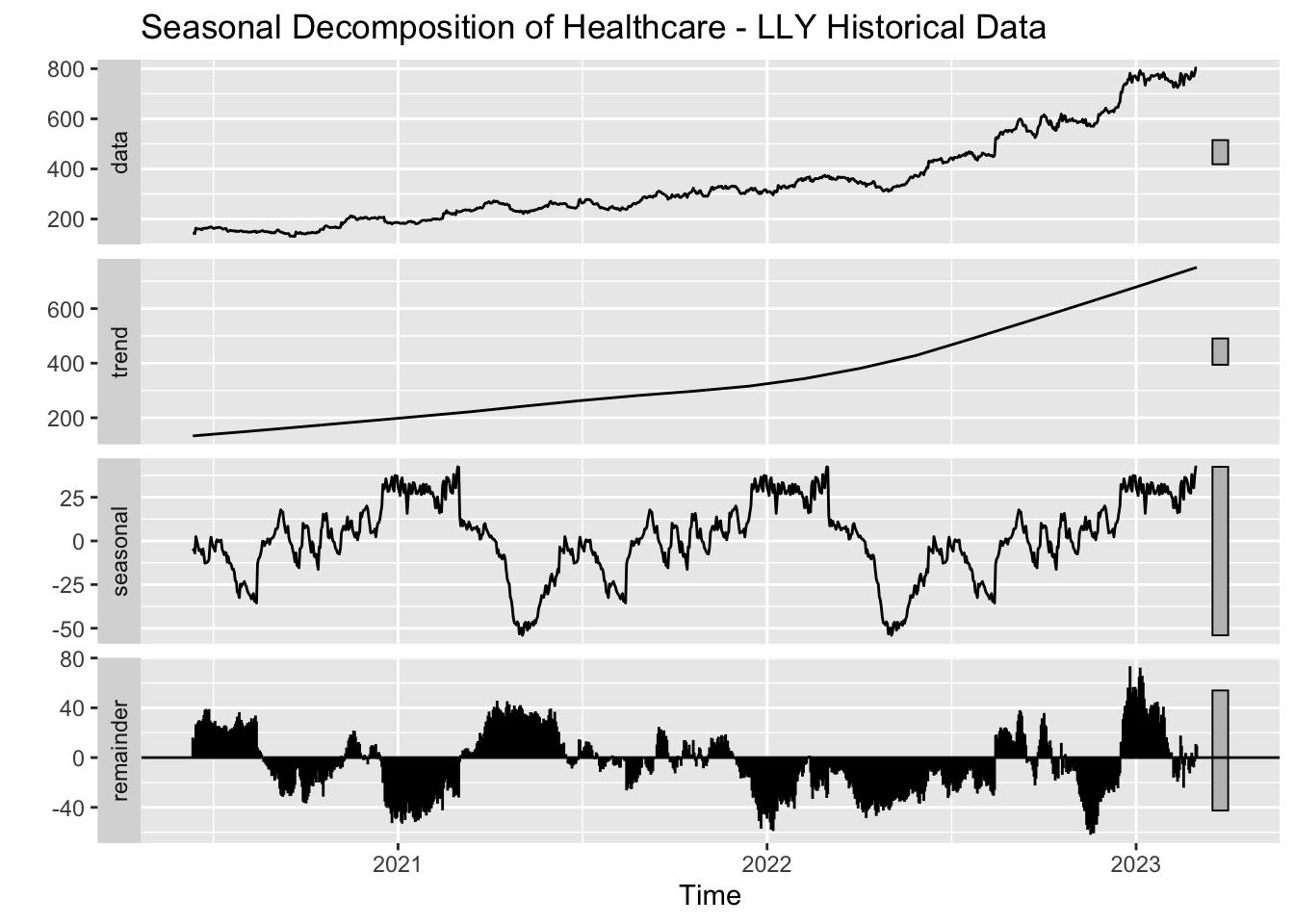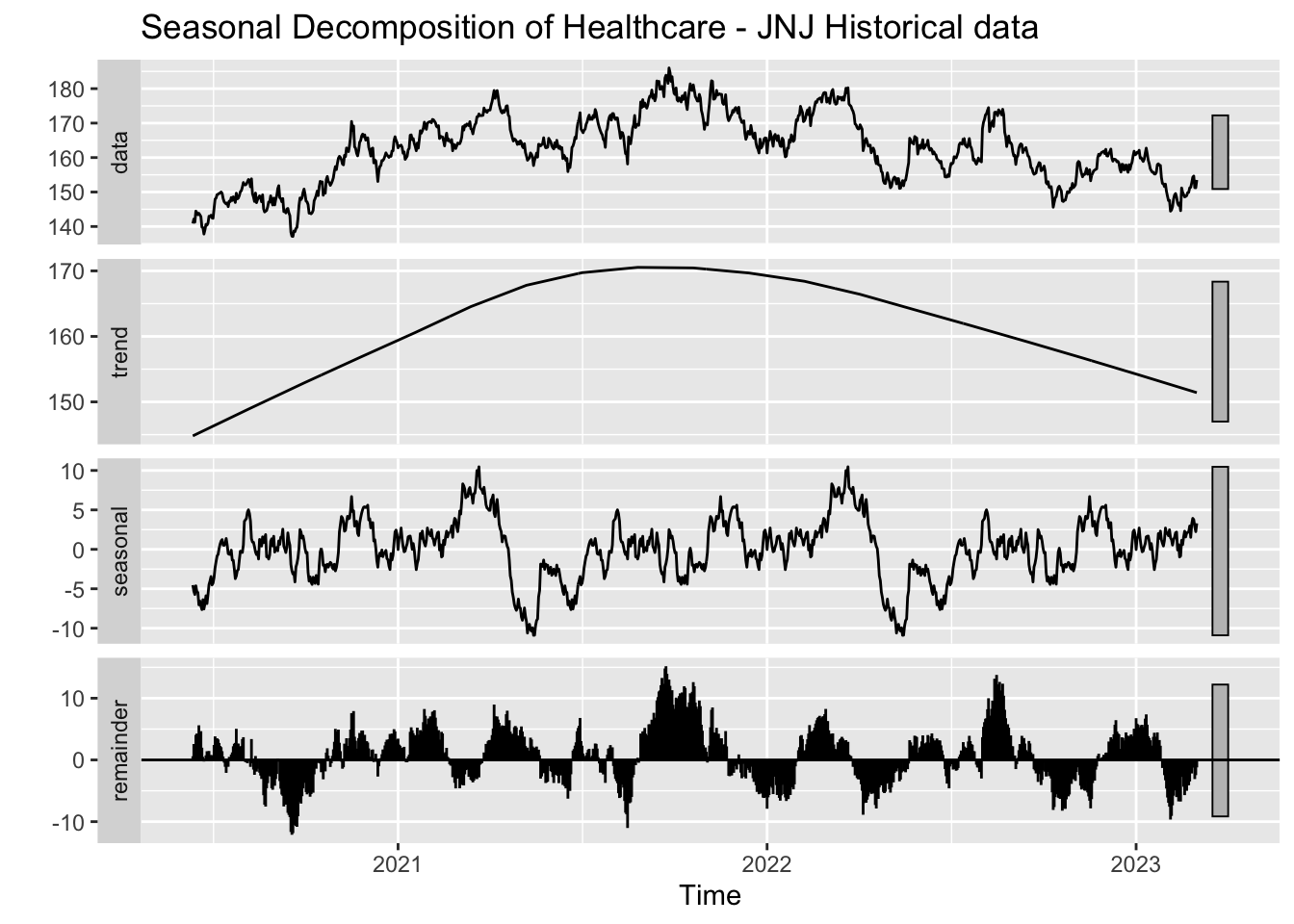library(ggplot2)library(tseries)health_data <- health_data |>filter(!is.na(close)) |>mutate(close =as.numeric(close))# Clean and prepare the datahealth_data <- health_data |>filter(!is.na(date) &!is.na(close)) |># Remove rows with missing Date or Pricemutate(Date =as.Date(date)) |># Convert Date to Date formatarrange(Sector, Source, date)analyze_seasonal_patterns <-function(data, sector) {# Filter data for the given sector sector_data <- data |>filter(Sector == sector)# Perform analysis for each stock sector_analysis <- sector_data |>group_by(Source) |>summarise(decomposed_plot =list({tryCatch({# Convert to time series object ts_data <-ts( close,frequency =365,start =c(year(min(date)), yday(min(date))) )# Seasonal decomposition decomposed <-stl(ts_data, s.window ="periodic")# Plot decompositionautoplot(decomposed) +ggtitle(paste("Seasonal Decomposition of", sector, "-", unique(Source))) }, error =function(e) {message(paste("Error processing decomposition for stock:", unique(Source)))NULL }) }) )# Return analysisreturn(sector_analysis)}# Perform analysis sector by sectorsectors <-unique(health_data$Sector)results <-map(sectors, ~analyze_seasonal_patterns(health_data, .x))# Save or display plotswalk2(sectors, results, function(sector, sector_result) {message(paste("Processing sector:", sector))walk(sector_result$decomposed_plot, function(decomp_plot) {if (!is.null(decomp_plot)) print(decomp_plot) })})