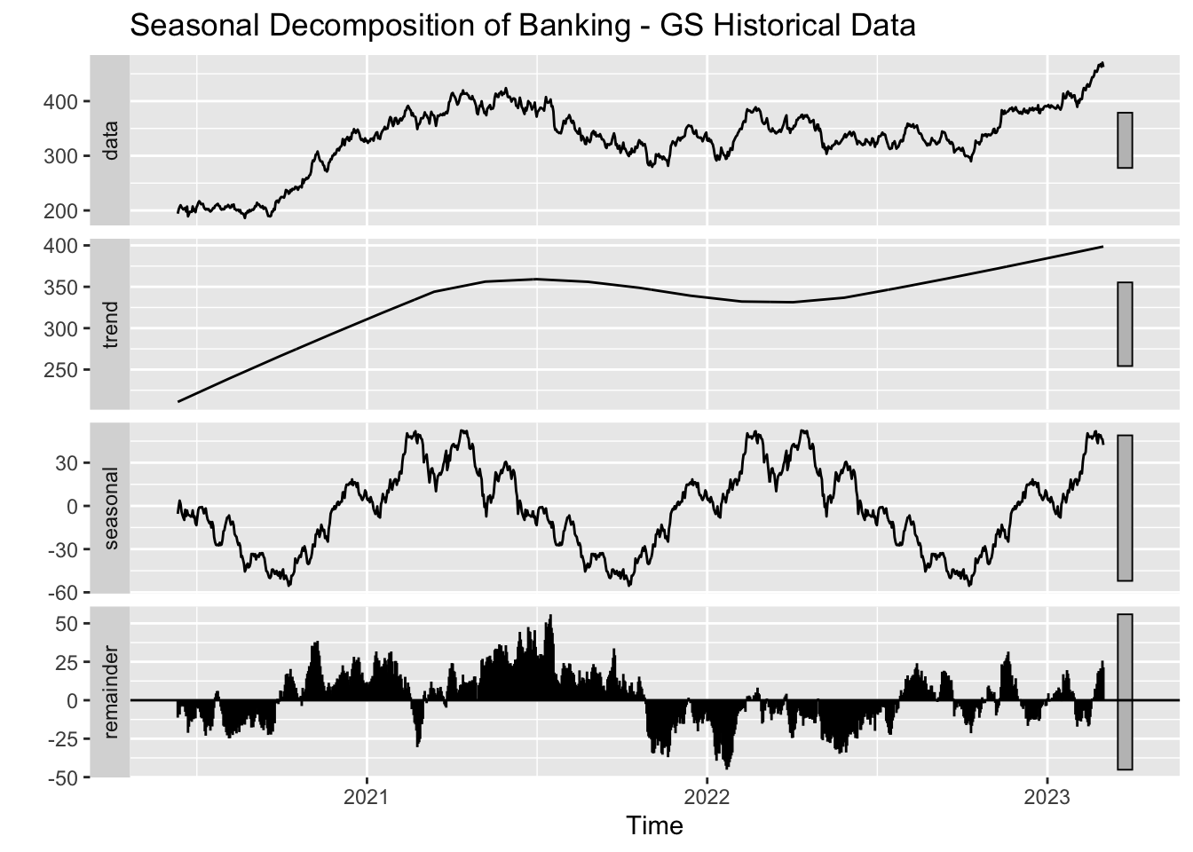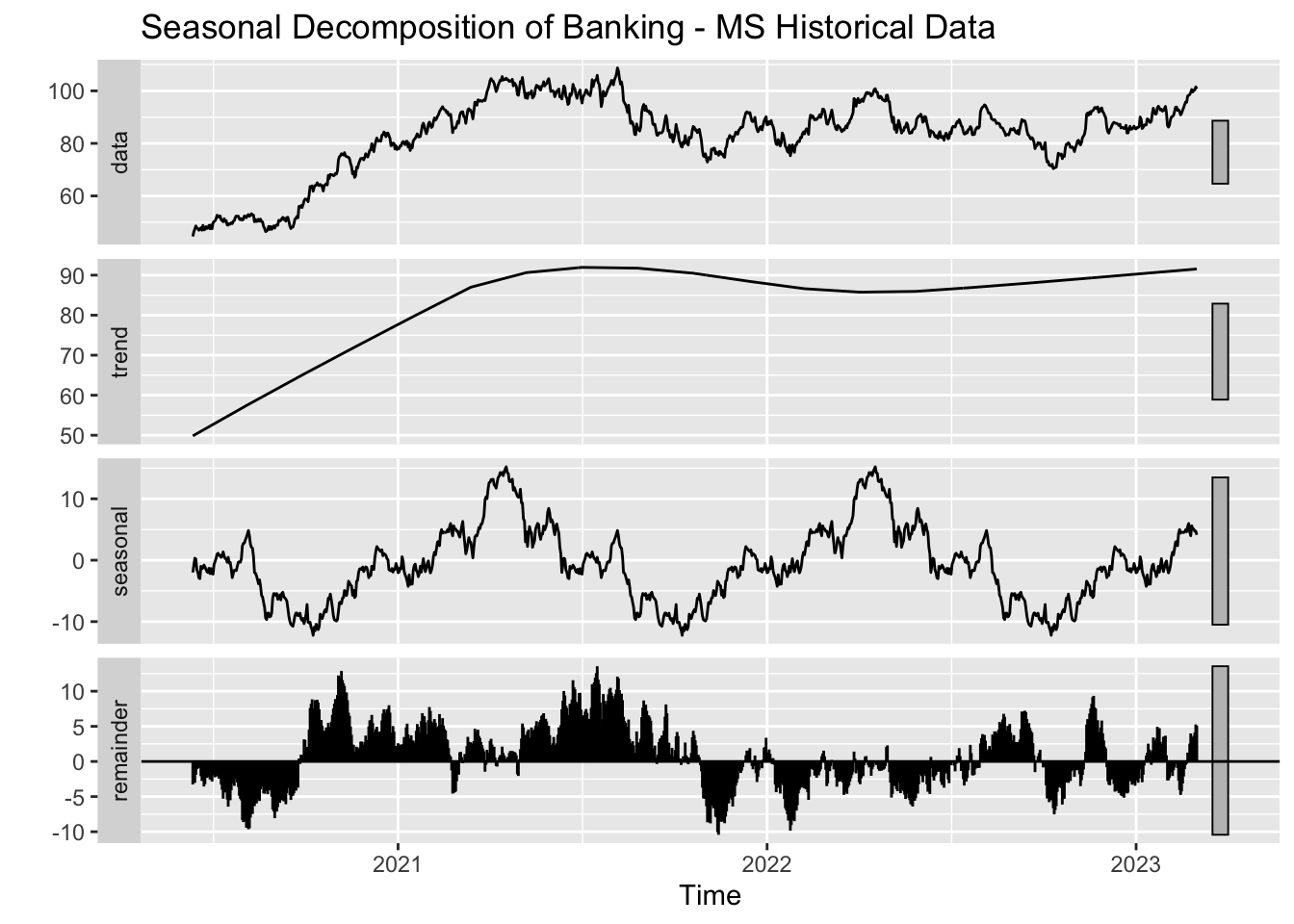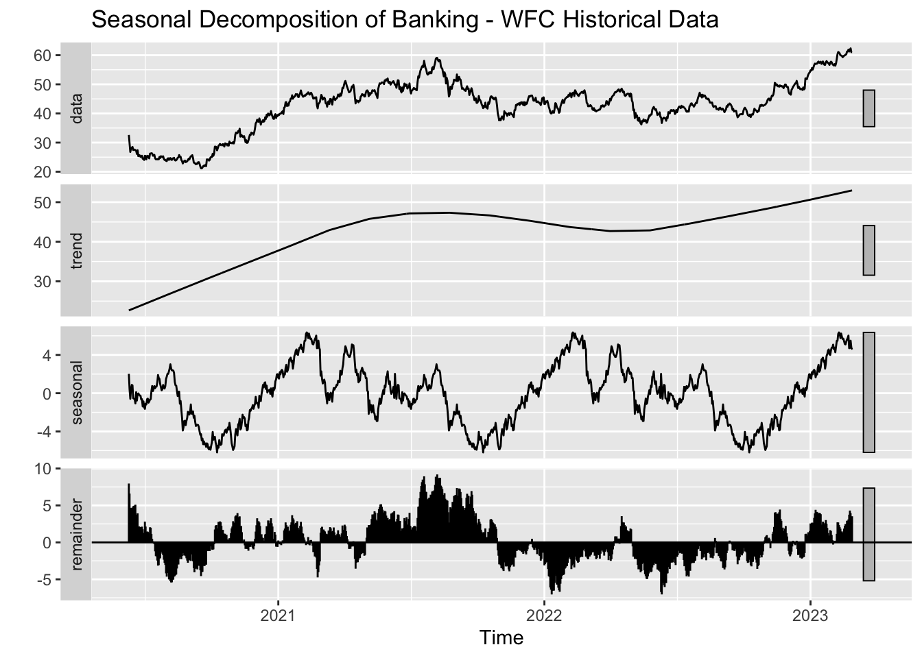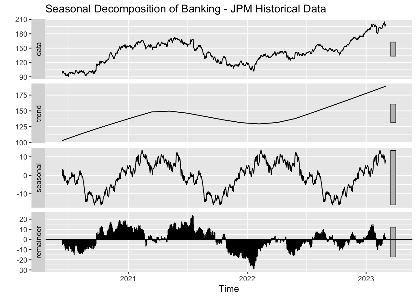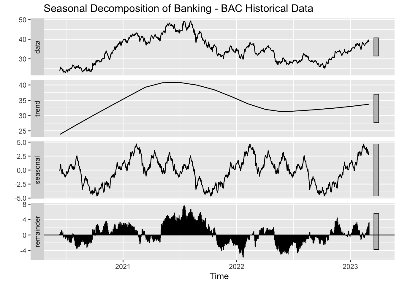 library(tidyverse)library(lubridate)library(forecast)library(ggplot2)library(tseries)# Clean and prepare the data# Clean and prepare the databanking_data <- banking_data |>filter(!is.na(date) &!is.na(close)) |># Remove rows with missing Date or Pricemutate(Date =as.Date(date)) |># Convert Date to Date formatarrange(Sector, Source, date)# Perform analysis sector by sectorsectors <-unique(banking_data$Sector)results <-map(sectors, ~analyze_seasonal_patterns(banking_data, .x))# Save or display plotswalk2(sectors, results, function(sector, sector_result) {message(paste("Processing sector:", sector))walk(sector_result$decomposed_plot, function(decomp_plot) {if (!is.null(decomp_plot)) print(decomp_plot) })})