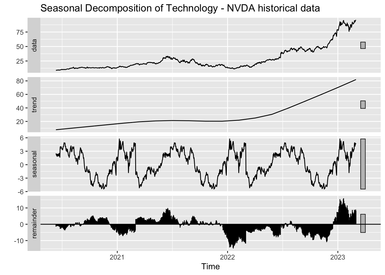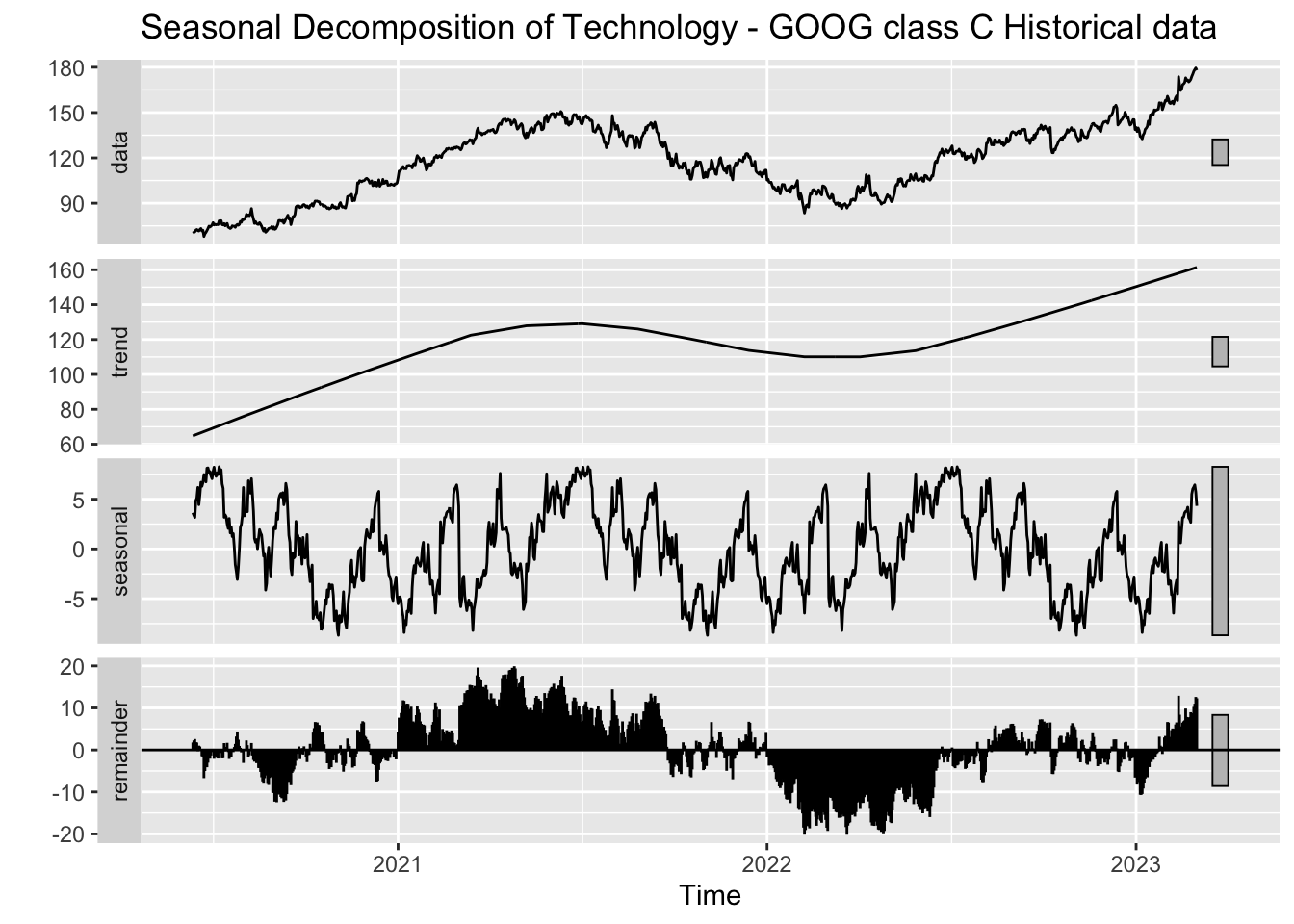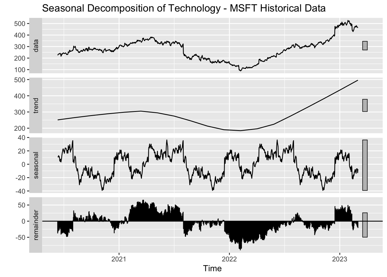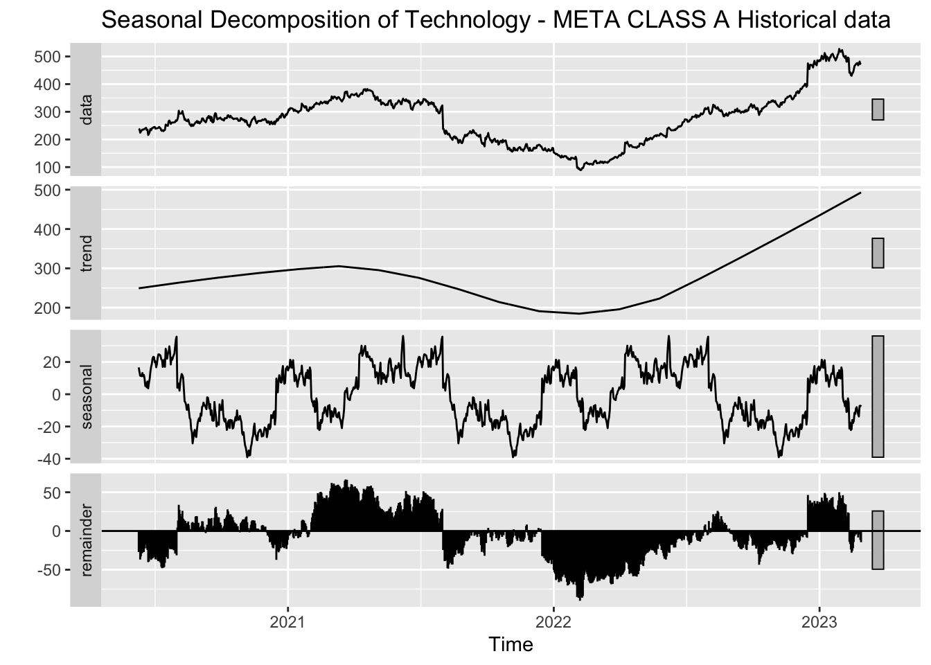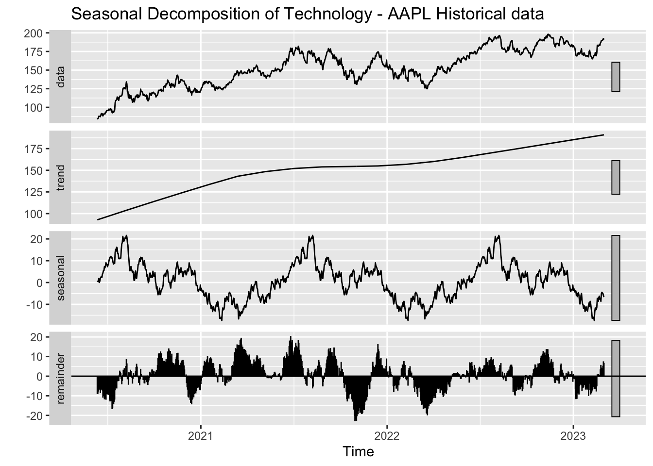 library(tidyverse)library(lubridate)library(forecast)library(ggplot2)library(tseries)# Clean and prepare the datatech_data <- tech_data |>filter(!is.na(date) &!is.na(close)) |># Remove rows with missing Date or Pricemutate(Date =as.Date(date)) |># Convert Date to Date formatarrange(Sector, Source, date)# Perform analysis sector by sectorsectors <-unique(tech_data$Sector)results <-map(sectors, ~analyze_seasonal_patterns(tech_data, .x))# Save or display plotswalk2(sectors, results, function(sector, sector_result) {message(paste("Processing sector:", sector))walk(sector_result$decomposed_plot, function(decomp_plot) {if (!is.null(decomp_plot)) print(decomp_plot) })})