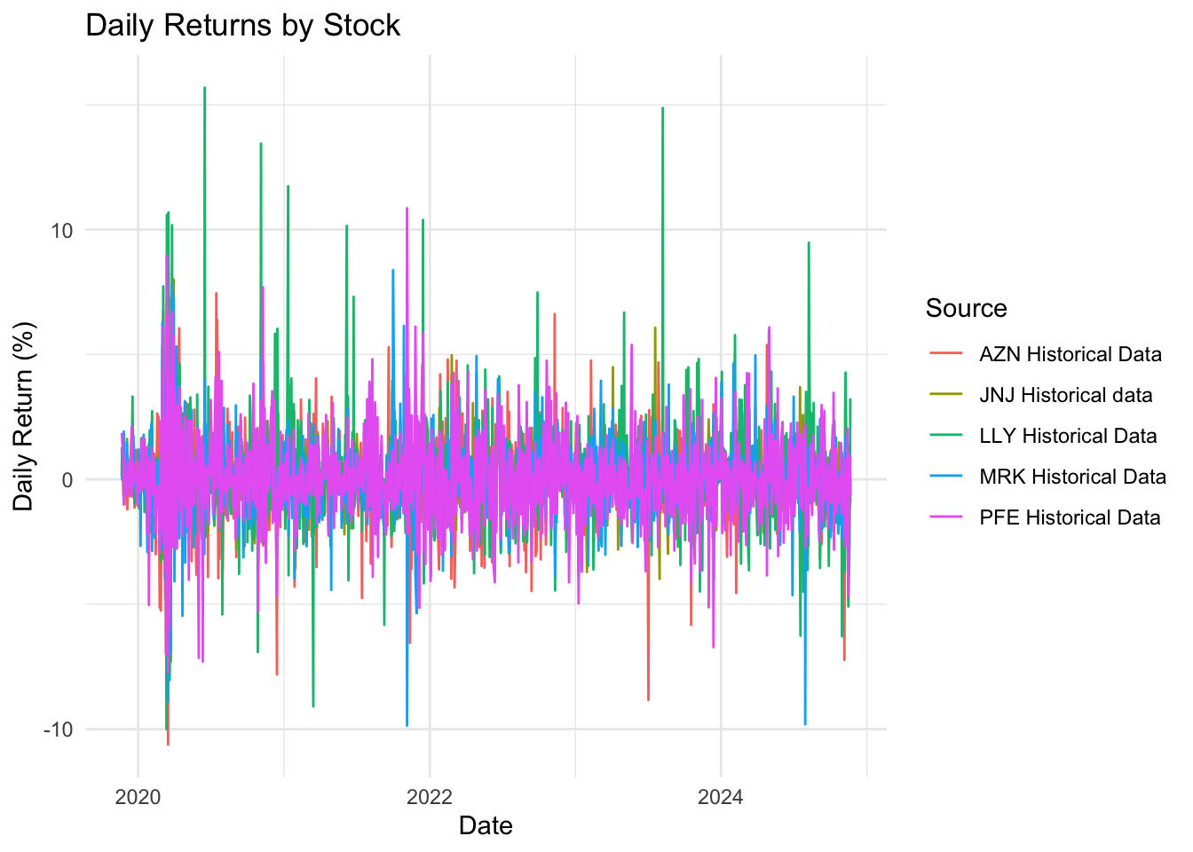 The ‘Daily Returns by Stock’ graph illustrates the daily returns of pharmaceutical stocks (AZN, JNJ, LLY, MRK, and PFE) over time. More spikes from 2020 to 2022 indicate a significant market event affecting the return of the stocks, such as the COVID-19 pandemic in early 2020. While the stock returns mostly stay close to zero, they seem to be affected by specific events like product launches, regulatory approvals, or market-wide shocks, which can be a factor for the fluctuations.