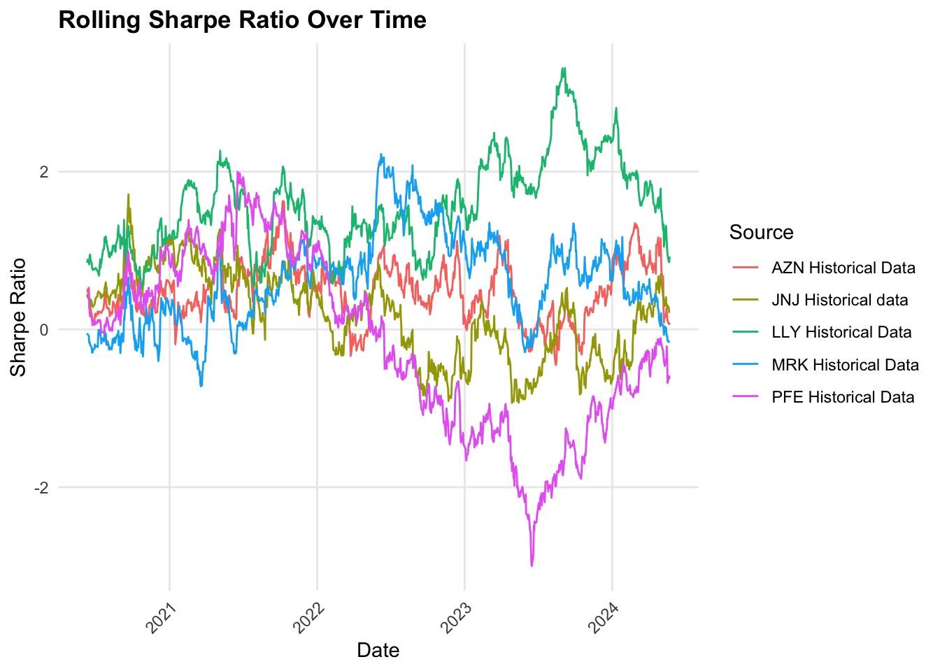 The ‘Rolling Sharpe Ratio Over Time’ graph presents the rolling Sharpe ratios of five pharmaceutical companies [AstraZeneca (AZN), Johnson & Johnson (JNJ), Eli Lilly (LLY), Merck (MRK), and Pfizer (PFE)] over time. LLY has a higher Sharpe ratio throughout suggesting. high-risk adjust performance. Meanwhile, AZN and MRK have sharp declines followed by recoveries, indicating that they have more risk and inconsistent returns. PFE has a high decrease in the Sharpe ratio between 2023 and 2024, where its returns didn’t justify the risks taken. Overall, LLY offers the best performance, while the others vary in volatility, with PFE and JNJ showing more stability but less favorable returns than LLY.