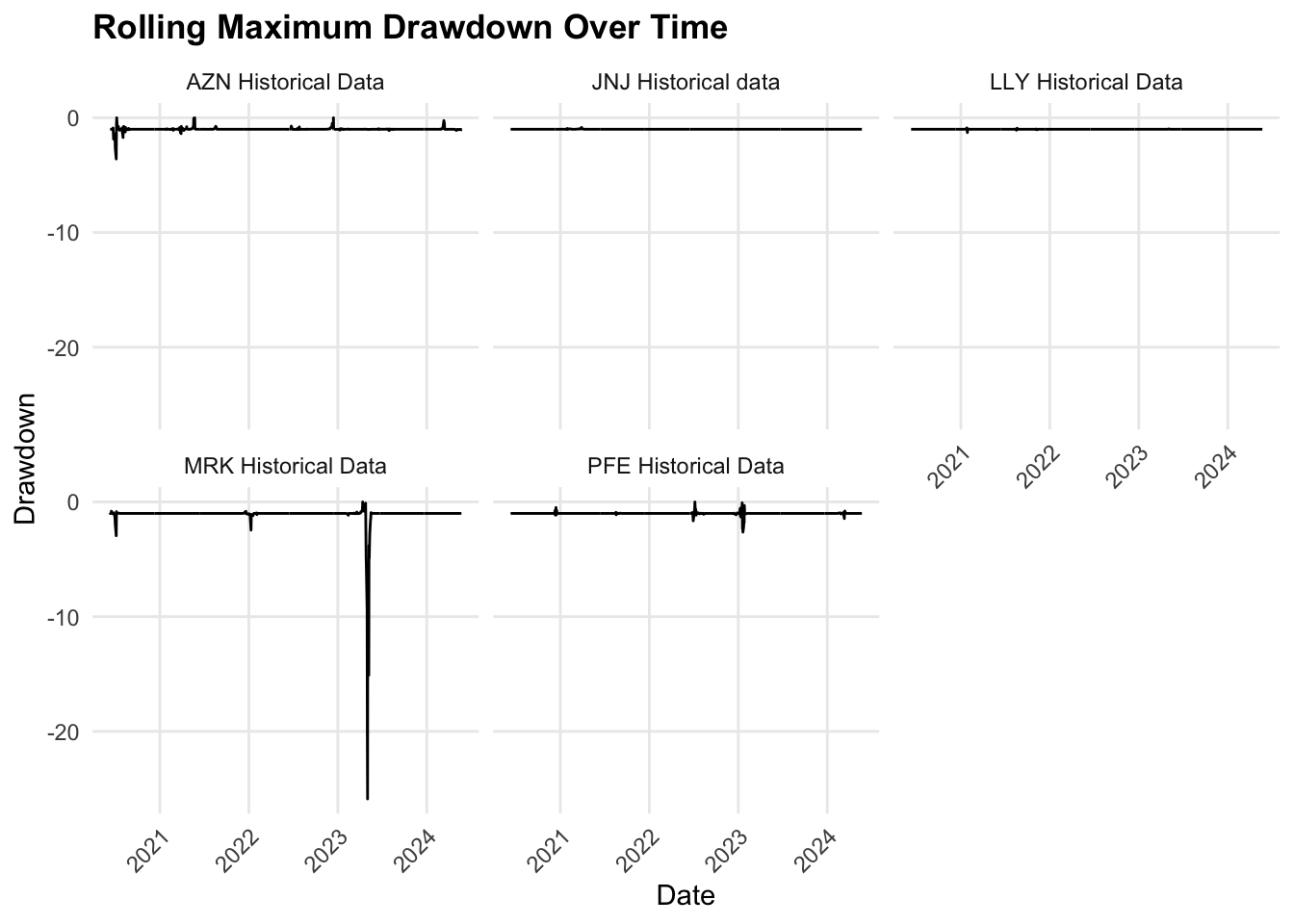 The graph shows the rolling maximum drawdown over time for historical data from five pharmaceutical companies. AZN, JNJ, LLY, and PFE displayed stability with minimal drawdowns, indicating consistent performance and a low risk of losses during the observed period. However, MRK stands out due to a sharp drawdown in 2023, suggesting a significant decline in its stock value during 2023, which could be because of specific events or financial difficulties.